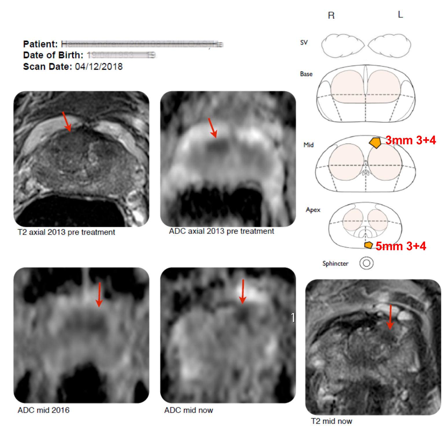 No evidence of seminal vesicle disease or pelvic lymphadenopathy.